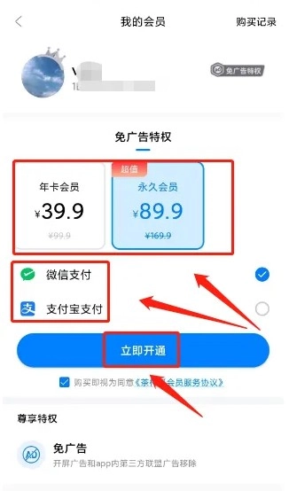 进入“我的”会员页面,挑选合适的会员套餐与支付方式后,点击【立即开通】按钮即可。