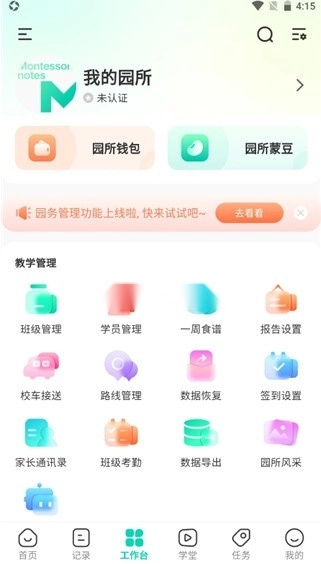 进入个人界面后,用户可以便捷地完成考勤签到、查看本班教案、浏览班级相册和添加新学员等操作。