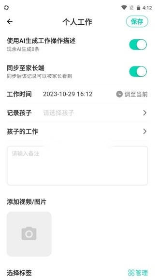 在这个页面,用户需要填写相关信息,同时选择是否同步到家长端。等信息填写完毕后,点击右上角的【保存】按钮就可以了。