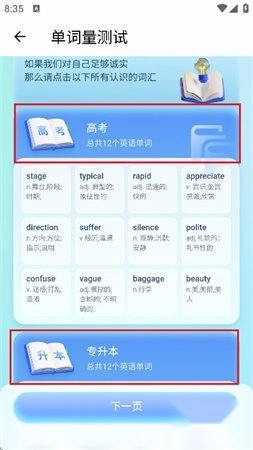 3、用户能够自主挑选其中一项服务并点击进入,比如单词量测试,点击之后,便能即刻开启测试,测试界面呈现如下。