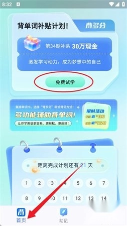 1、接着安装背多分单词软件,安装完成后打开该应用,在首页点击“免费试学”按钮,以此开启学习。