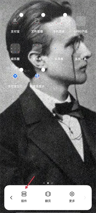 1、长按桌面,选择添加插件/插件。