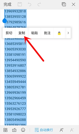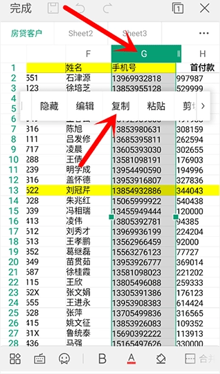 注意:其他电话名单中的手机号所在列不一定是G列。只需找到包含手机号的那一列,点击该列最上方的字母,就能选中这一列的所有号码。选中号码后,将复制条向右滑动,就会出现复制选项。
