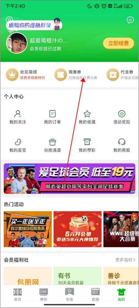 成功购买体育会员后,将获赠2张观赛券。获赠的观赛券会立即发送至您的会员账户。您可在手机端进入“我的”-“观赛券”,或在电脑端进入“我的账户”-“账户信息”进行查看。