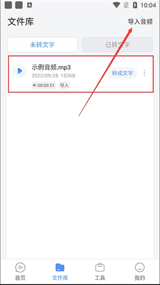 2、在“文件库”页面,您能看到全部文件。要是需要转换的文件不在该目录下,您还可点击右上角的“导入音频”功能进行导入。