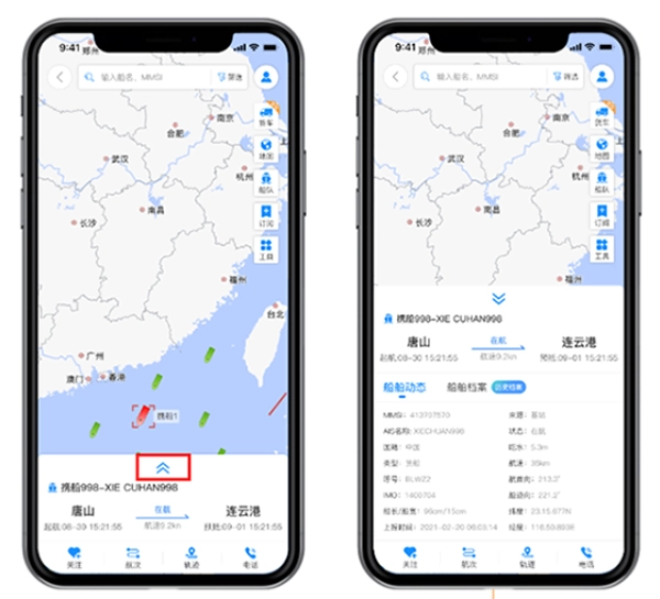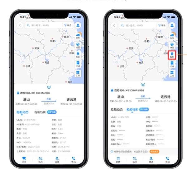 点击底部“关注”按钮,就能添加到船队,地图上随即显示所关注船舶的最新位置信息。