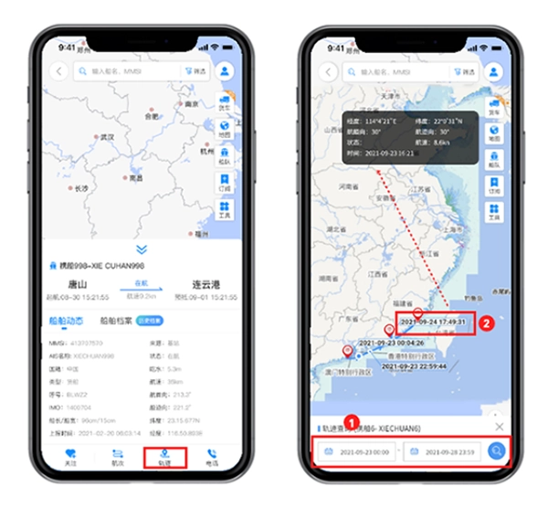 1. 选中底部的“日期选择器”,接着点击“查询”按钮,这样就能查询到该时间段内的船舶轨迹。 2. 点击“具体时间节点”,便能够查询历史状态。