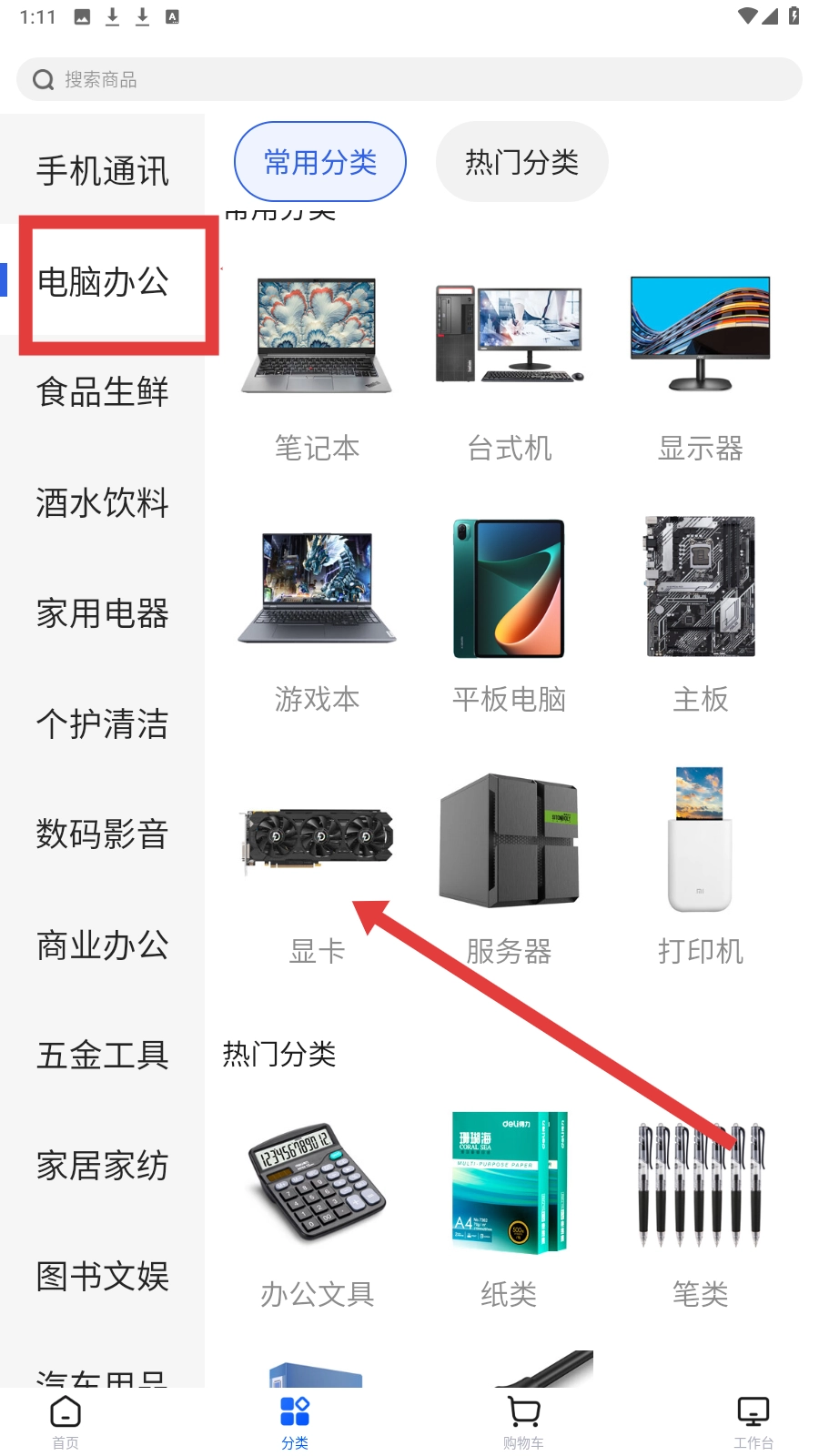 1. 轻点【分类】,进入商品分类页面,依据自身需求挑选【电脑办公】等商品类别。
