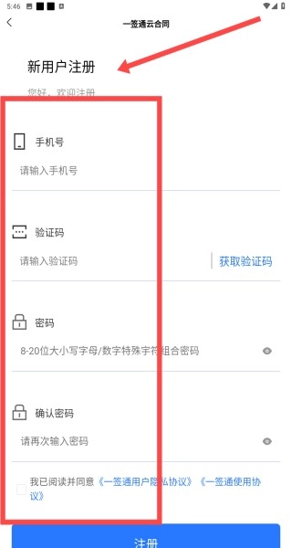 3、在一签通新用户注册页面,需填写手机号、验证码、密码等信息,勾选协议后即可完成注册流程。