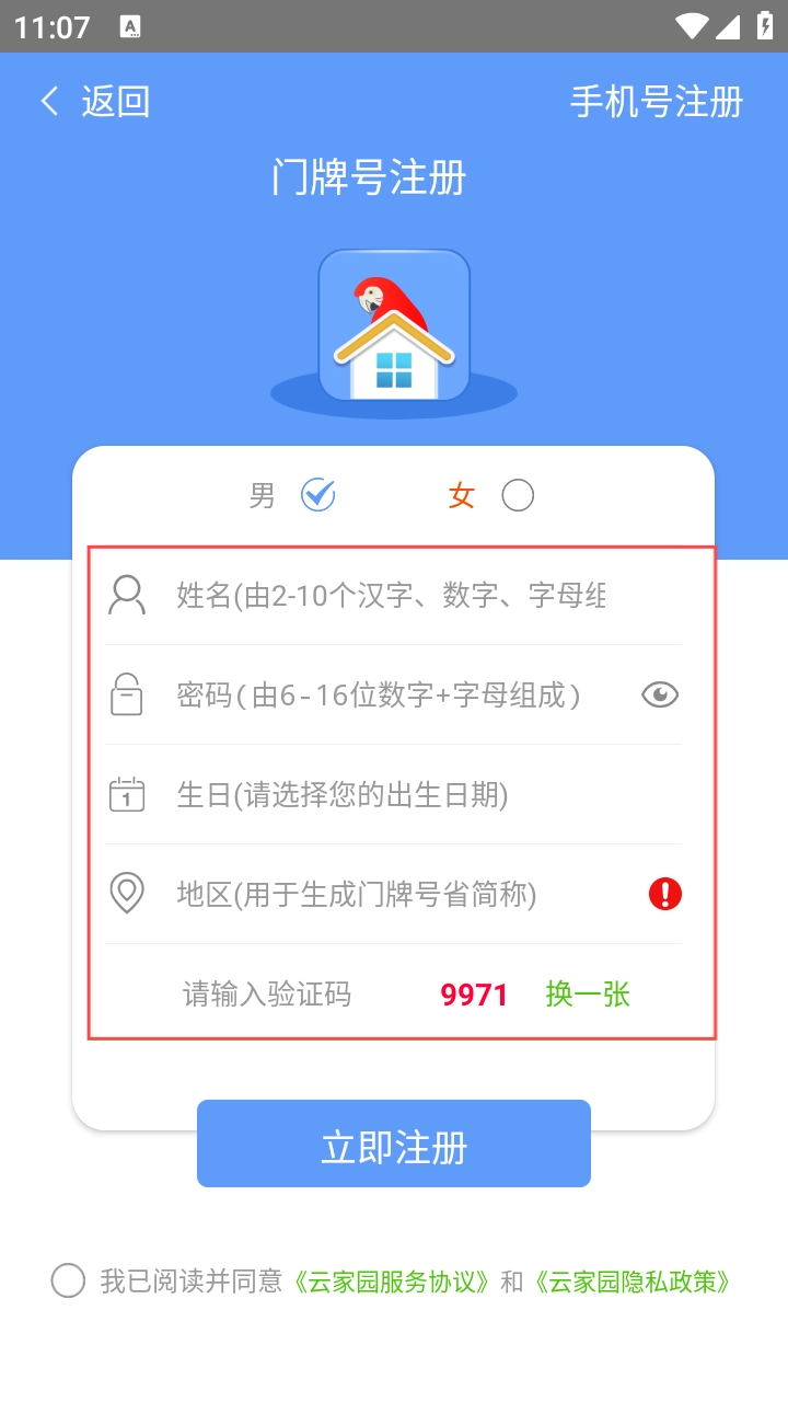 3、进入【门牌号注册】页面后,在红框区域内,按顺序填写姓名、密码、生日、地区以及验证码等相关信息。