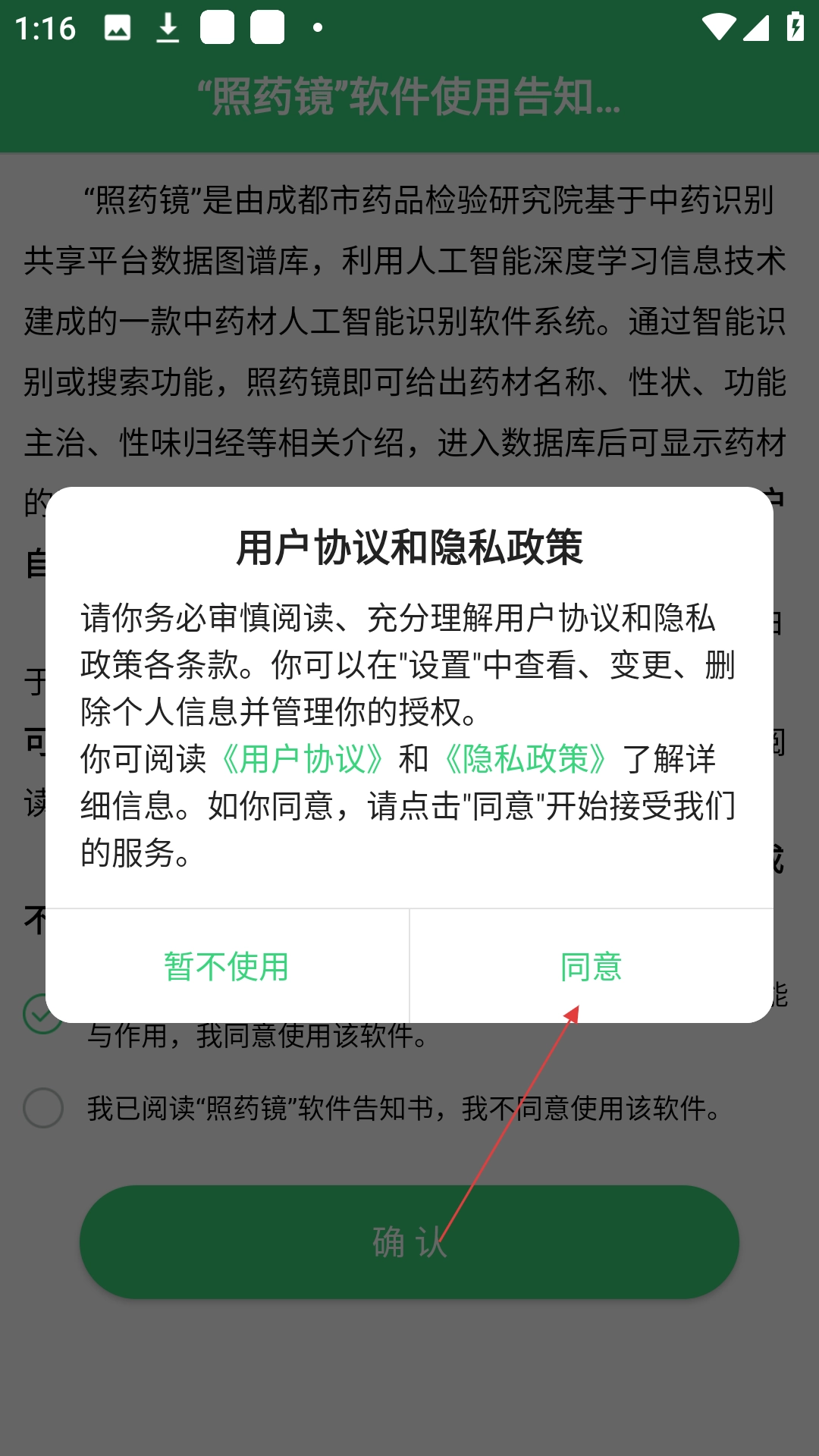2、在用户协议和隐私政策弹窗中点击【同意】按钮。