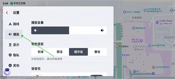 设置板块提供导航、播报、通用等选项的调整功能,同时支持对显示信息进行更改。