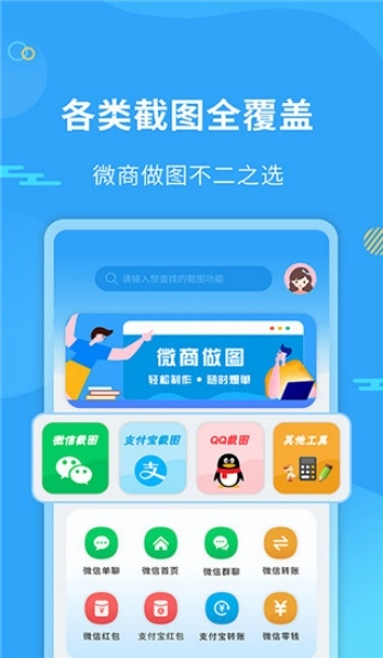 这款软件可支持微信、支付宝、QQ平台的制图需求,能生成二十余种不同类型的图片,并且提供免费一键生成相关截图的功能。