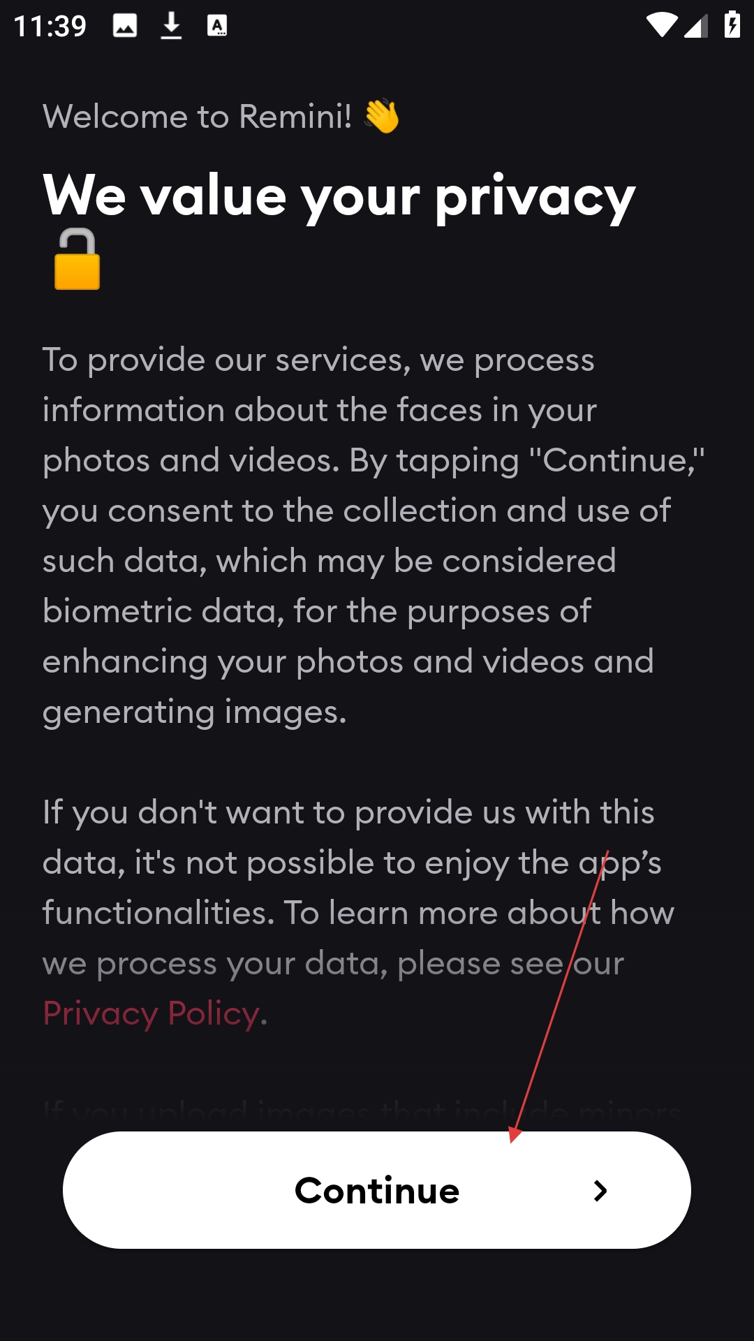 1. 在隐私政策说明页面,点击【Continue】按钮,即可进入应用主界面。