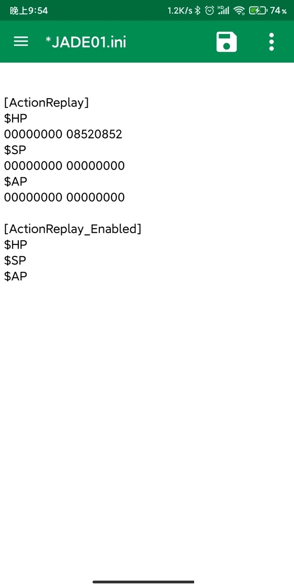 4、总共两行,一行是[ActionReplay],此为放置代码之处;另一行是[ActionReplay_Enable],这是应用代码的地方。在[ActionReplay_Enable]下方仅填写[ActionReplay]中代码的名称,如图所示,这便是一个简单完整的金手指,之后保存就行。