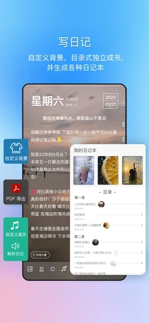 【仿真日记本】这款日记本翻页流畅丝滑,支持目录编辑功能,能在WORD中设置多种字体样式并搭配图片,还可以添加喜欢的音乐,帮你定格记录生活点滴。它具备人声朗读功能,让你随时回味日记里的美好时光!更有密码和手势双重私密保护,为你的日记安全重重加码。