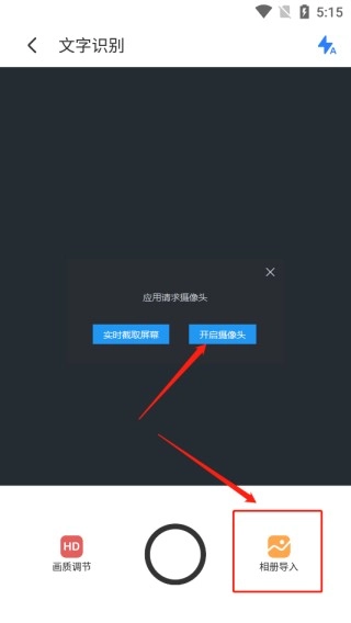 以“图片提取”功能为例,用户只需选择图片素材即可启动在线文案提取流程。点击该功能后,系统会自动打开相机界面,用户可通过现场拍摄、实时屏幕截取或从相册导入这三种方式来完成素材选取与文案提取操作。