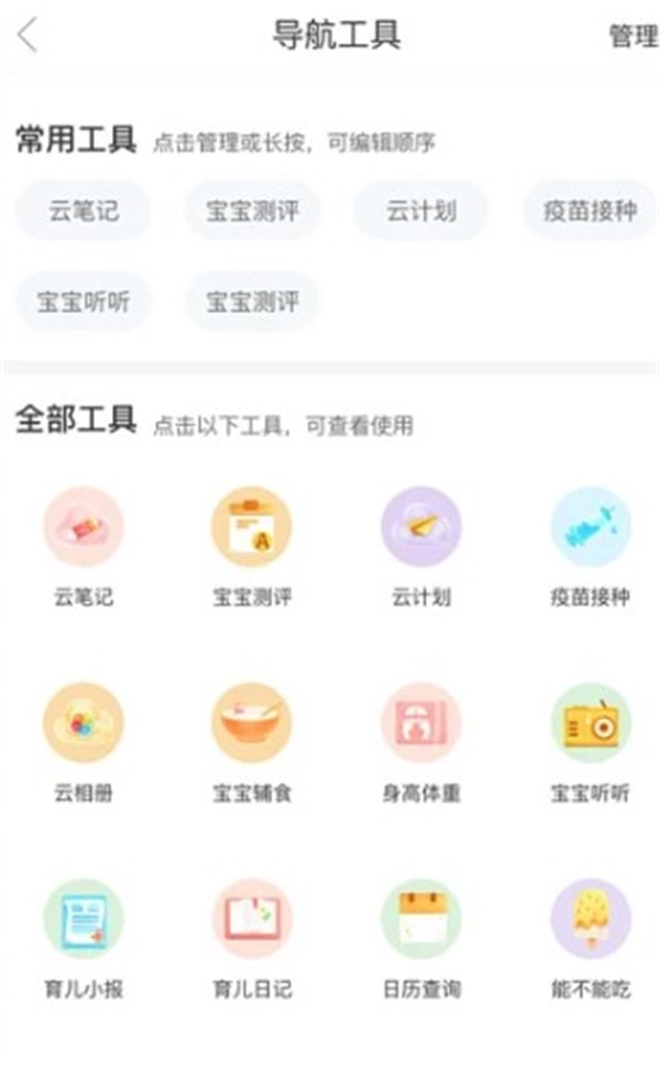 在这个汇集了多种育儿实用工具的专属页面上,你可以根据需求自由调整工具的排列顺序,轻松找到所需的功能。