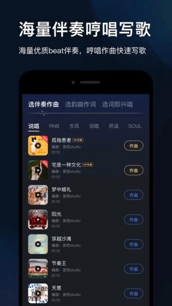 平台贴心提供免费伴奏,曲库每周持续更新,流行、说唱、摇滚、古风、民谣、电音、弹唱等各类曲风应有尽有。展望未来,会有众多编曲人纷纷入驻,为大家打造更多优质伴奏。但需说明,这部分后续或许会收取一定费用,毕竟编曲老师们也得维持生活嘛~
