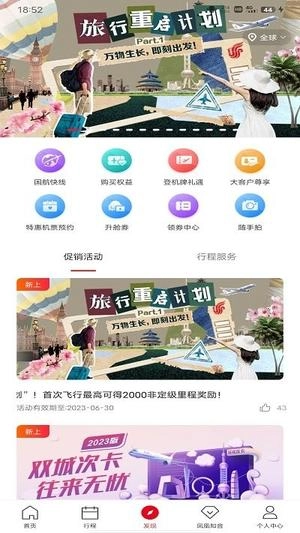 在发现栏目里,为用户配备了各类功能,涵盖国航快线、登机牌礼遇、大客户尊享、特惠机票预约、升舱券、领券中心等服务。