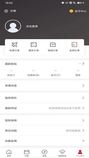 在“我的”个人中心页面,用户能够完成登录操作,同时还能使用机票订单、服务订单、商城订单、全部订单、优惠券、报销凭证、功能反馈等功能。