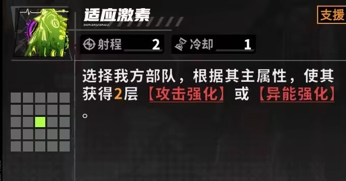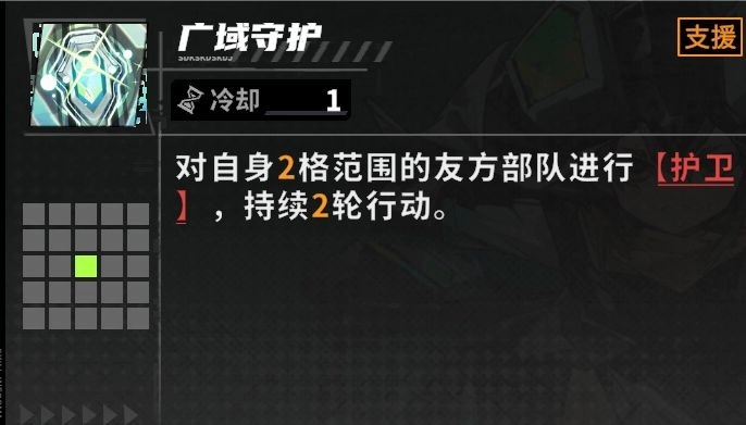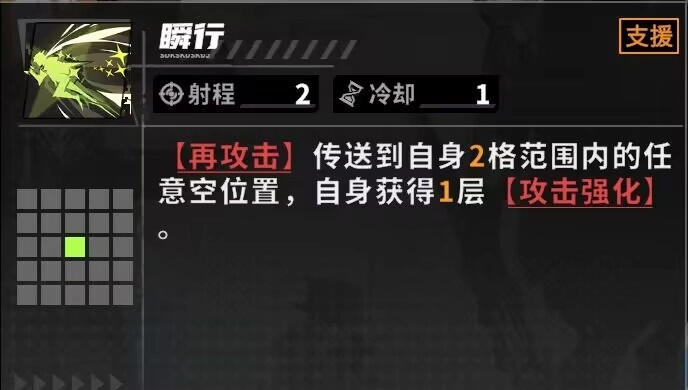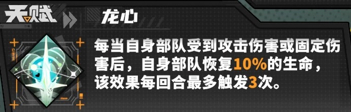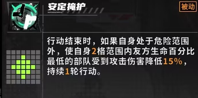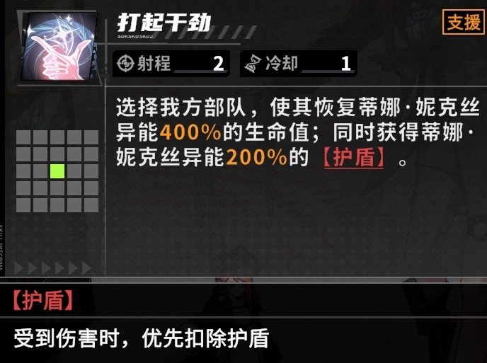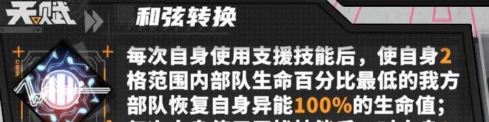 妮克丝的天赋效果为:在释放支援技能后,会让自身周围两格范围内,我方部队中百分比生命值最低的单位恢复生命值。