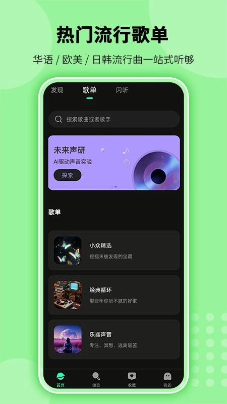 呈现当下热门流行的歌单,让用户能一站式畅听,还可实时浏览热门歌曲榜单。