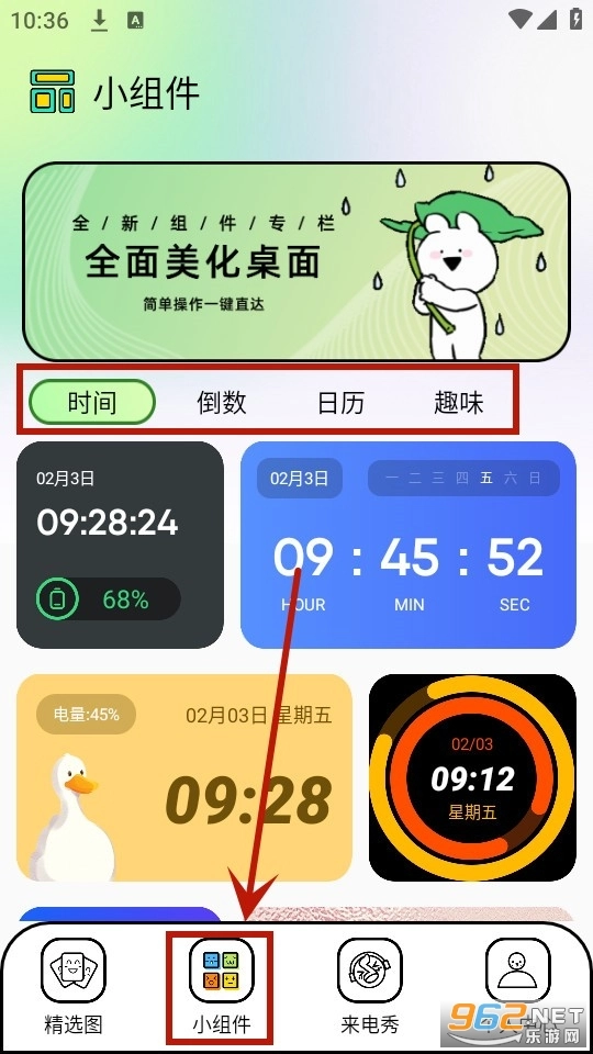 小组件界面支持直接设置各类所需的小组件,你可以直接从上方的分类里进行选择。