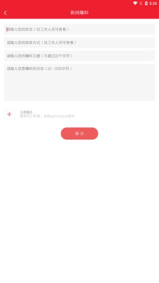 接着填写投稿人的姓名、联系方法、投稿的主题、投稿的具体内容以及相关图片,之后点击【提交】按钮就可以了。