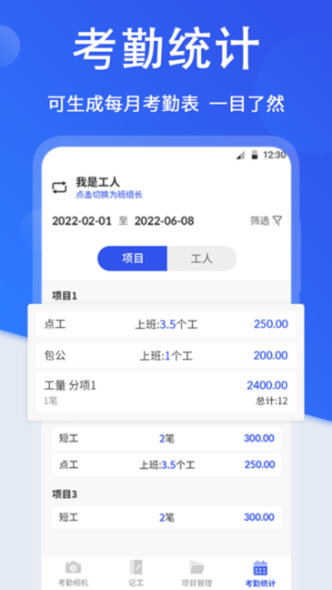 【工地记工】支持工人班组长一键切换身份,能便捷记录各项目及工友的考勤工时,包工、点工、小时工、短工、工量等类型均可一键记录,是集记工本、记工表、记工天、记工时、记加班功能于一体的工地记工考勤相机软件,助力工地管理、工程管理、项目管理与考勤管理更高效省心。