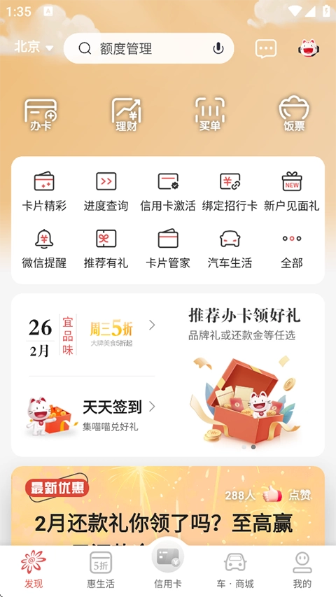 福利秘籍超值放送:无论您是否持有招商银行信用卡,都能享受掌上生活平台的专属优惠福利:美食5折畅享,大片9元观看,大牌商品0元申领,爱奇艺等视频会员9元即可购买,此外还有爆款手机12期免息分期、限时抢购满额赠礼、碎屏保险、五星酒店免费入住、特惠旅行等丰富优惠活动。