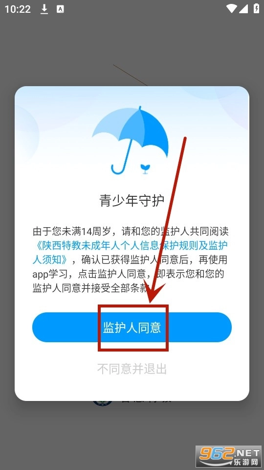 先安装并打开“陕西特教”应用,接着点击“同意”按钮以确认同意隐私政策。