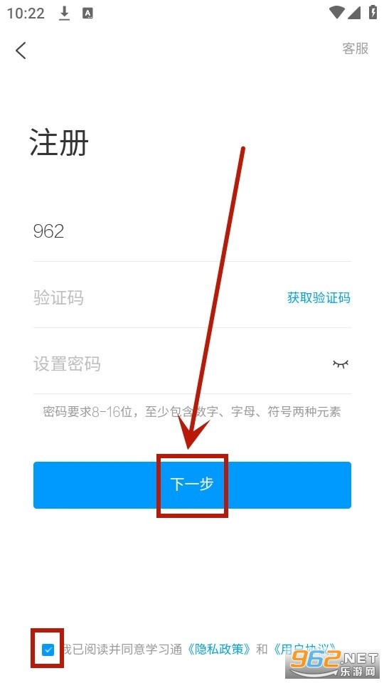 勾选用户协议,依次输入手机号、验证码、密码等信息,点击“下一步”按钮,即可完成注册流程。