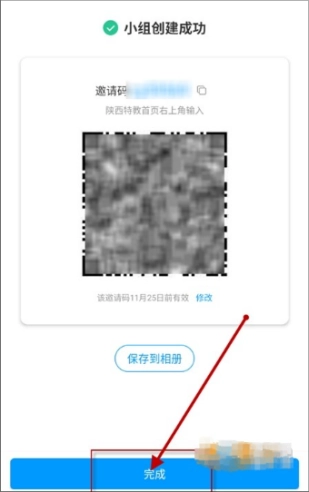 小组创建成功后,系统会自动生成邀请码和二维码,用于邀请新成员加入,点击“完成”按钮即可。