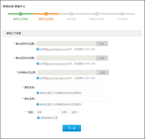 请按照要求上传身份证的正面、反面照片以及手持身份证的照片,接着选择你的居住地区,在确保所有信息都填写完整无误后,点击界面上的【下一步】按钮即可。