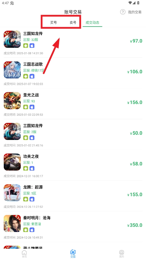 选择交易类型,买号还是卖号,比如买号