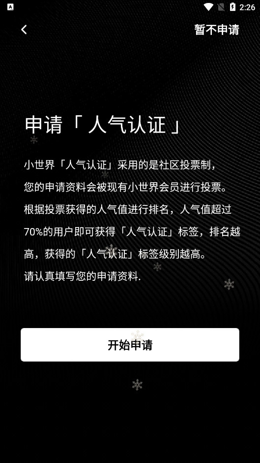 考虑到你对社交平台的品质有较高期待,《小世界-1%邀请制社交App》作为付费会员制社交平台,为你筛选出的都是各领域的佼佼者。平台通过严格审核机制,彻底杜绝托儿、营销账号及机器人账号,保证每位用户均为真实个体。高颜值是小世界的鲜明特色,汇聚了众多走在时尚前沿的俊男靓女,让平台氛围更具活力。同时,礼貌是在小世界畅行的基础准则,任何不礼貌行为都将导致账号封禁,以此维护和谐友善的交流氛围。众多优秀人士已相聚小世界,期待你的加入,快来提交申请吧!