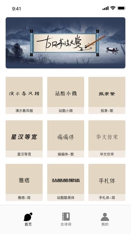 海量收录篆书、隶书、草书、行书、楷书。只需要选择字体