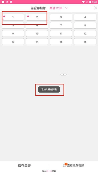 3、于缓存界面里挑选缓存清晰度,接着点击想要缓存的集数,即可将其加入缓存列表。