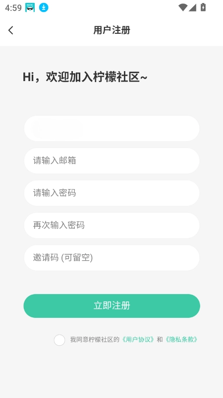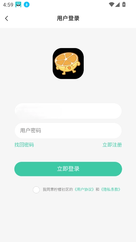 安装柠檬社区,打开应用后点击“同意并接受”;
