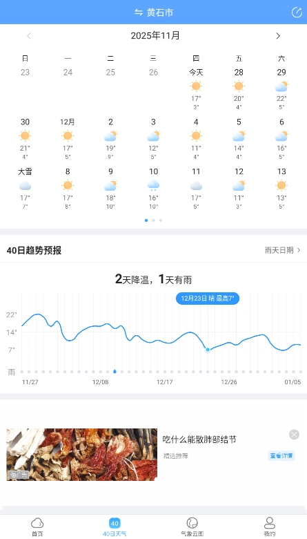 切换到长期预报页面,就可以查看未来40天的气温波动、降水可能性等信息,为中长期行程安排提供帮助。