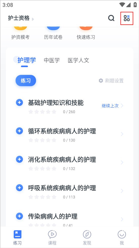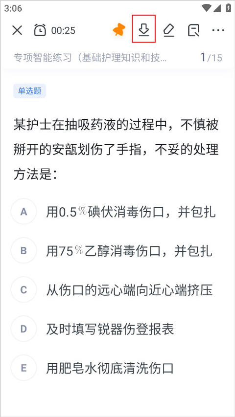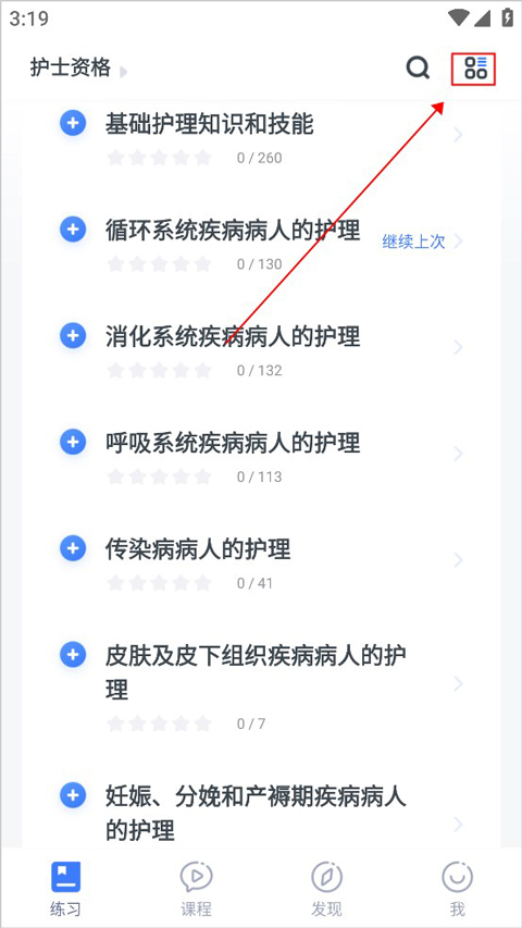 从实际测量的截图中可以清楚地看到,白色的背景颜色象征着“白衣天使”的形象。在练习板块的题库选项里,挑选你想要练习的题库,接着进入练习界面,在顶部找到“”图标。