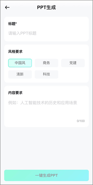 输入PPT标题,挑选合适风格,明确内容要求,就能生成完整的PPT并导出保存。