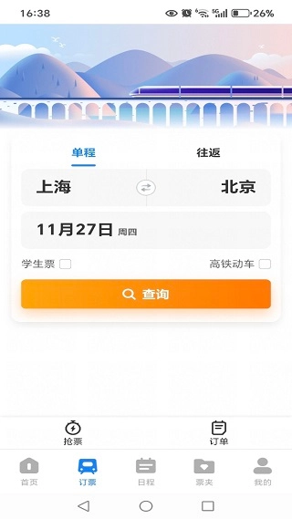 在订票页面,我们可以根据行程安排搜索车票,并且设置抢票提醒功能。