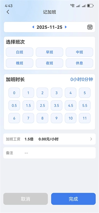 快速记录模块具备班次选择、时长录入以及自定义工资标准设置的功能。