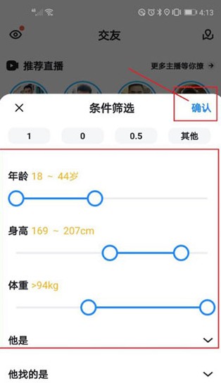 在条件筛选页面,你可以依据特定条件来搜索用户。选好条件后,点击右上角的“确定”按钮,就能启动搜索操作了。