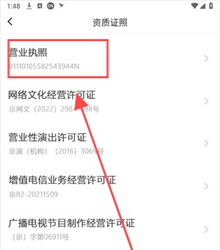 其次,进入资质证照界面,点击其中的营业执照功能