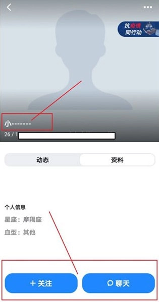 在这个用户界面里,你可以点击底部的操作按钮,来完成关注或者聊天的操作。