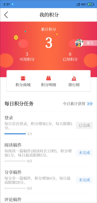 点击积分板块,就能查看已获得的积分,还有每日的积分任务。
