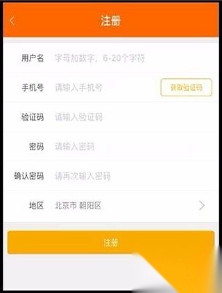 用户在注册页面依次填写用户名、手机号、验证码和密码,选定所在地区后,点击注册按钮即可完成账号注册。